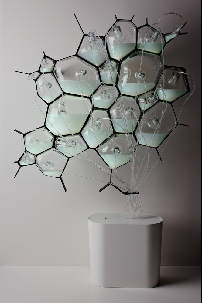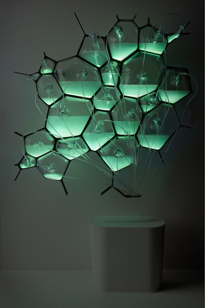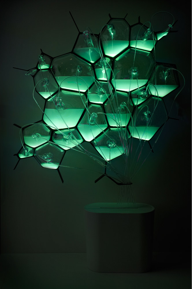 The concept explores the use of bio-luminescent bacteria fed with methane and composted material (drawn from the Bio-digester above). Alternatively the cellular light array can be filled with fluorescent proteins that emit different frequencies of light.